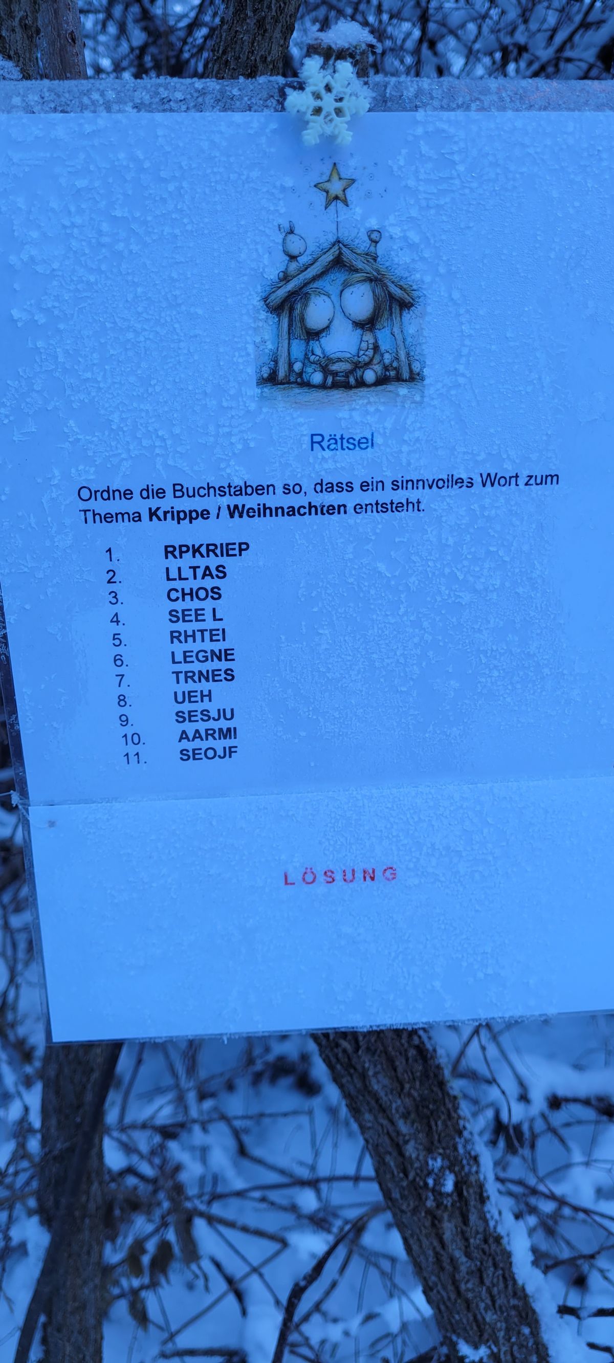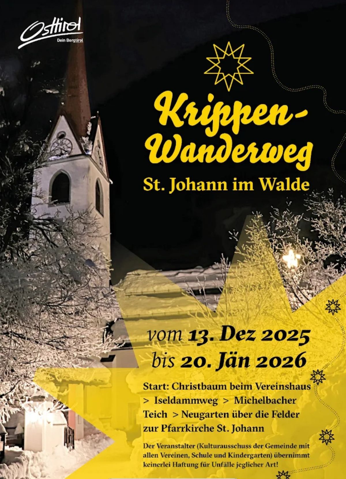 Für Kurzentschlossene gab es am 28.12.2025 eine Einladung nach St. Johann im Walde. Dort hat die Gemeinde mit allen Vereinen, Schülern und Kindergartenkindern einen Krippenweg gestaltet. Beginn war bei der Isel bzw. bei der Gondel und von dort ging es dem Iseltrail entlang. In Abständen von 5 bis 10m standen da selbstgemachte Krippen oder Kunstwerke rechts oder links des Weges. Einfach toll und sehenswert, was hier entstanden ist. Man geht dann bis Michelbacher Teich, dort ein Stück der Landesstraße entlang und über die Felder wieder retour nach St. Johann Nähe Kirche. Wir sind dann beim Wirt Moar im Walde zum Aufwärmen eingekehrt und schließlich zurück zu den Autos und wieder heimgefahren.