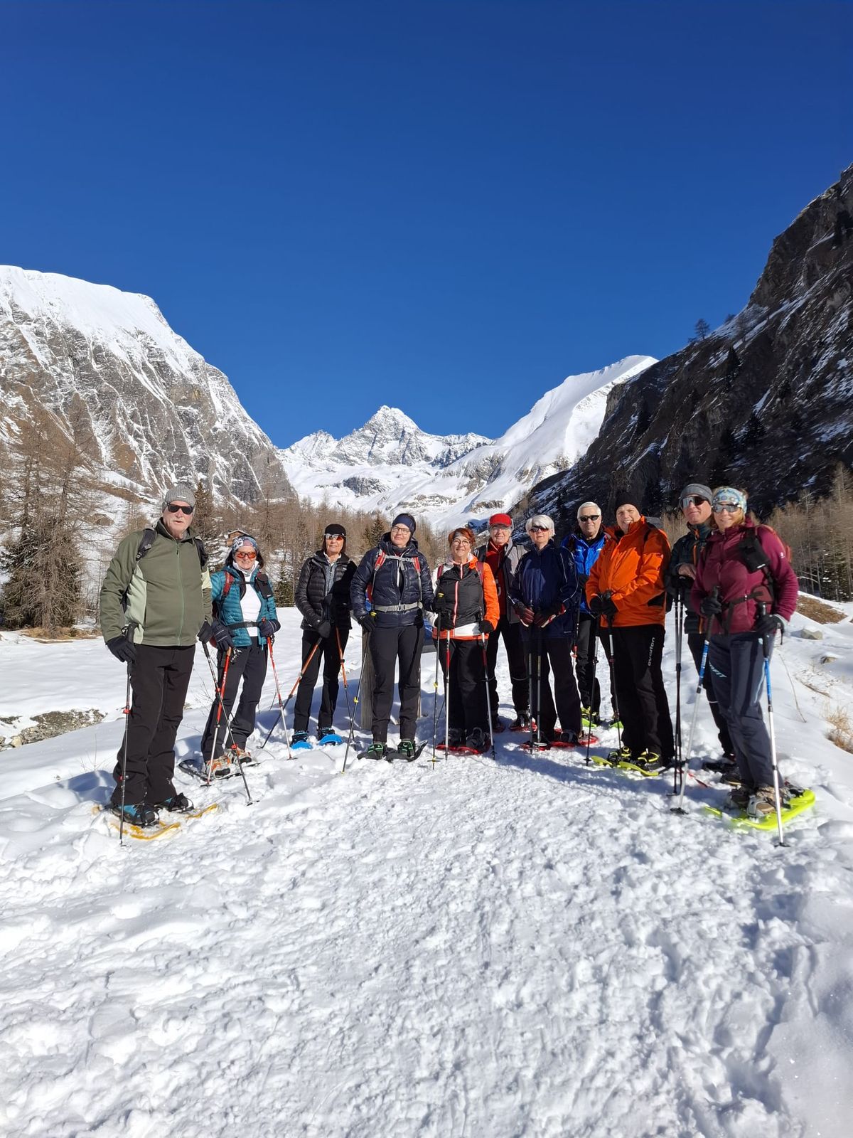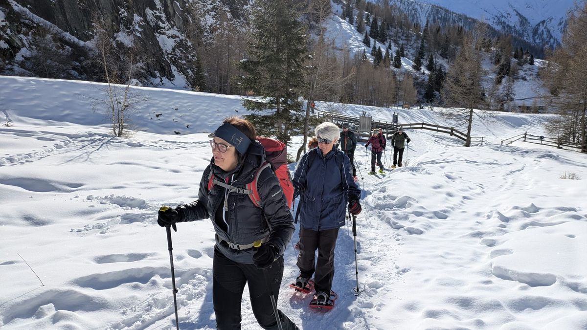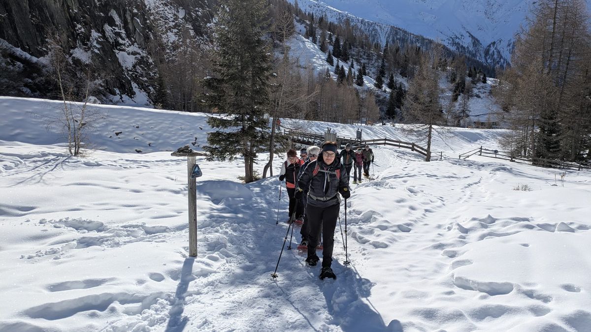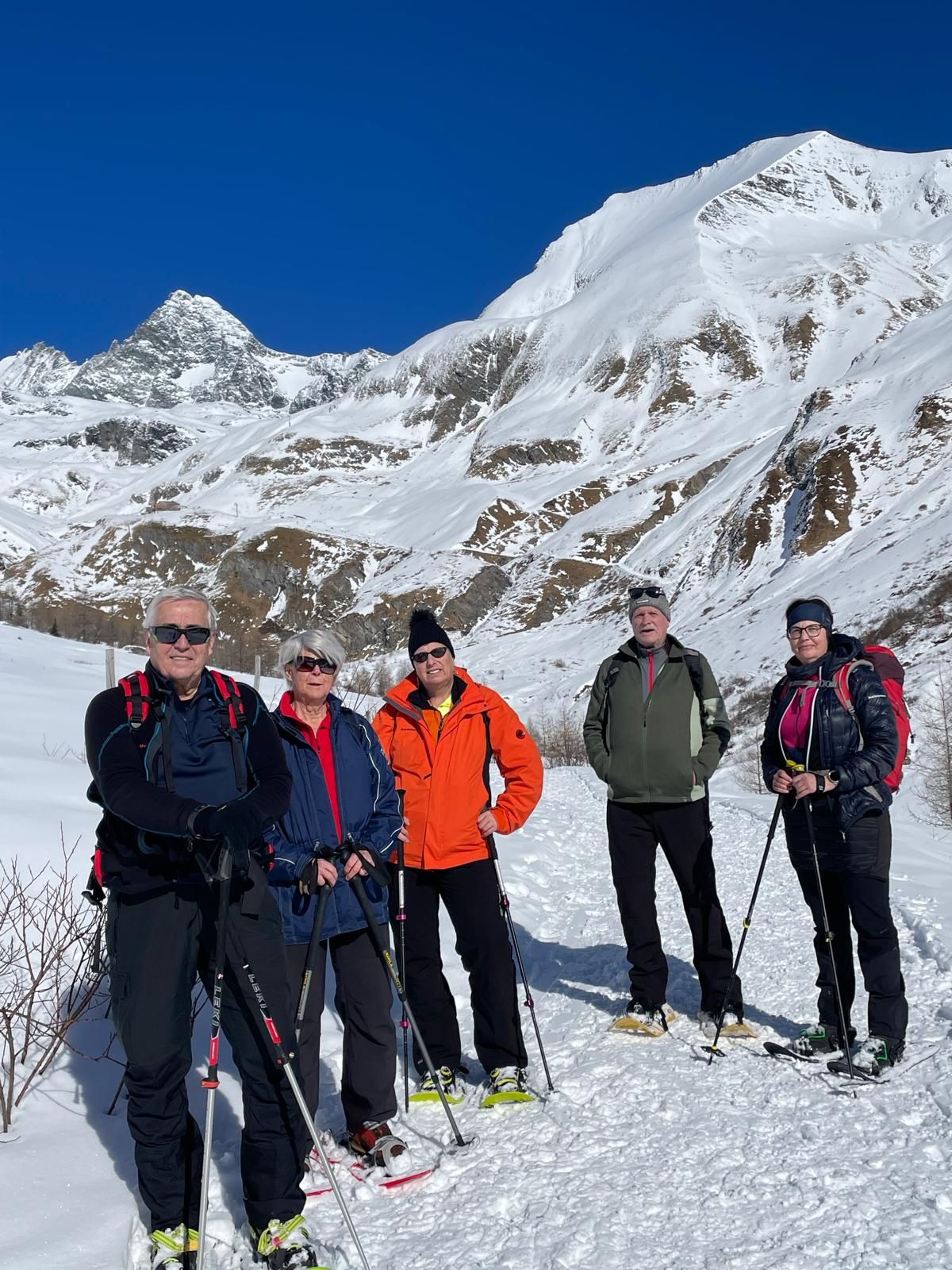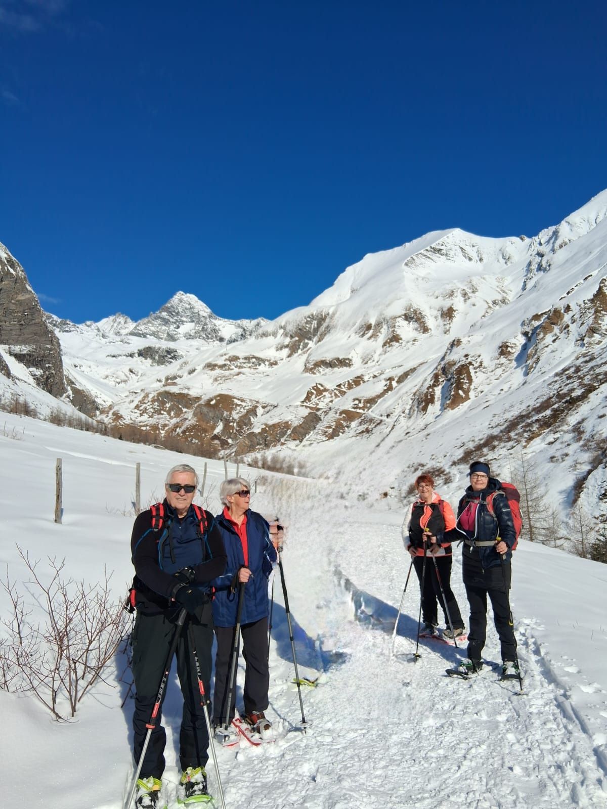 Wir trafen uns bei der Gemeinde bzw. in Lienz und fuhren mit Privatautos nach Kals zum Lucknerhaus. Dort wurde geparkt, die Schneeschuhe angelegt und los ging's bei traumhaftem Wetter mit wenigen Minusgraden und einem Blick auf den Großglockner, in Richtung Materialseilbahn. Immer wieder musste die Kamera gezückt werden, da der Großglockner einfach einladend aus dem tiefblauen wolkenlosen Himmel lachte. 6 Personen gingen sogar noch hoch zur Lucknerhütte, 2.241 m (diese war geschlossen).